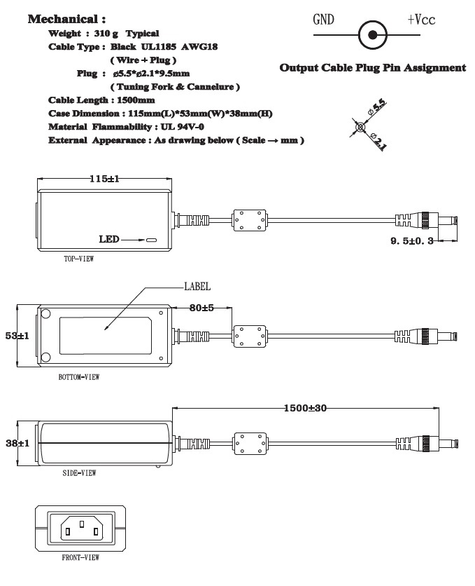 雷射自動準直儀使用的 AC 變壓器/DC 電源線。